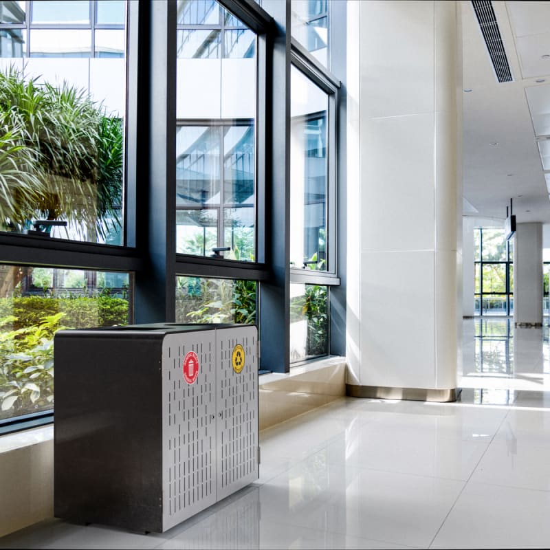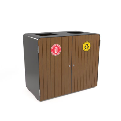 Compact capsule double litter bin design for undercover. Panels in hardwood or Duraslat™ colors, and cut-out designs in powder-coat finishes.