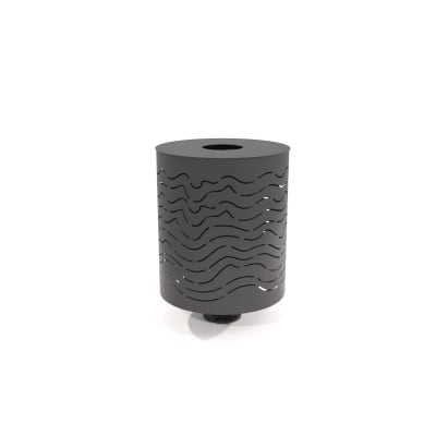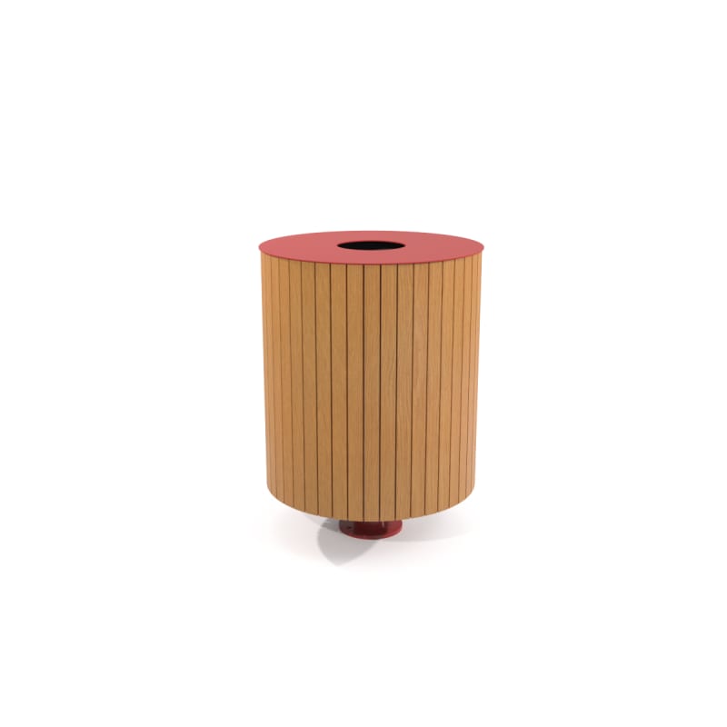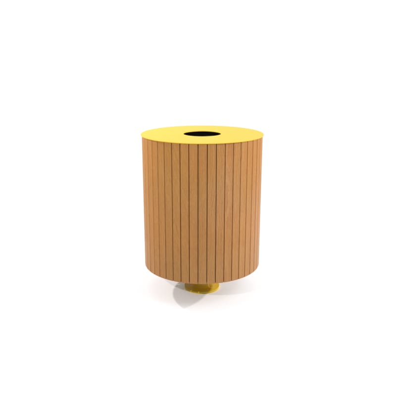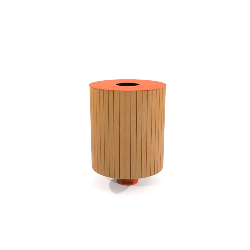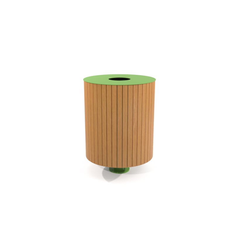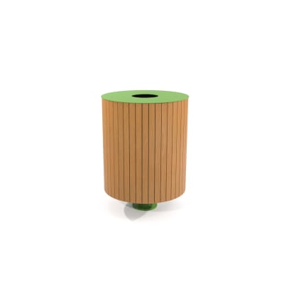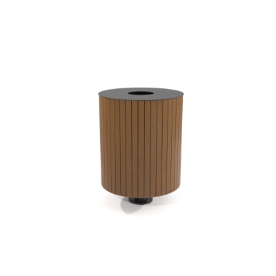 Modern, round capsule single post litter bin for undercover. 360° panel design in hardwood colors or cut-out designs in powder-coat finishes.