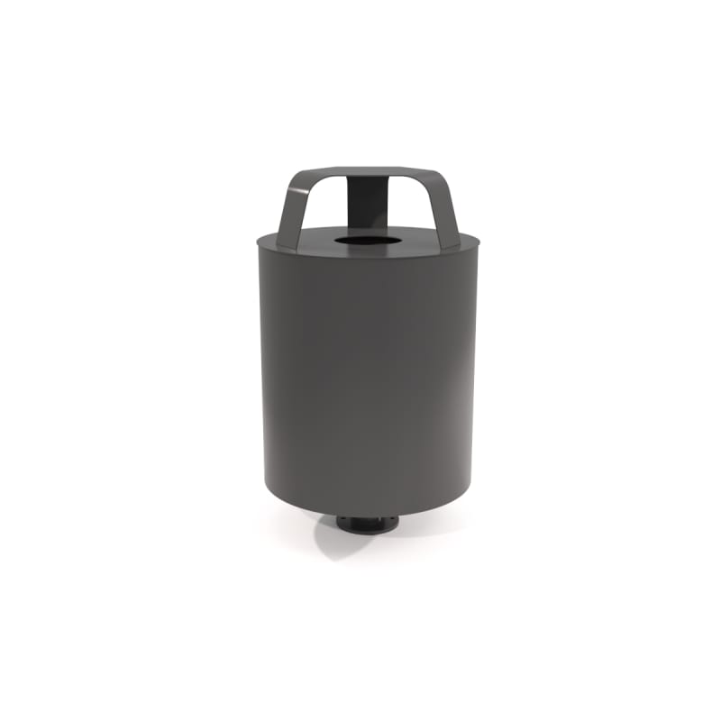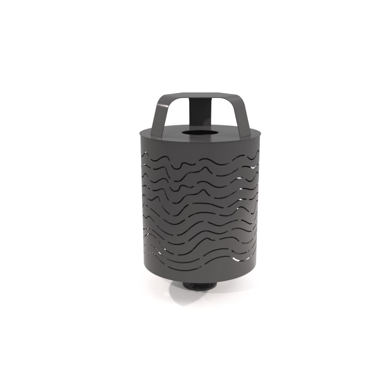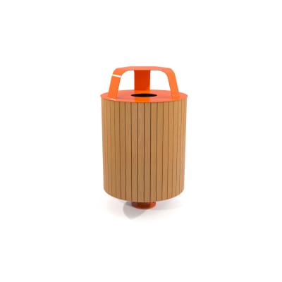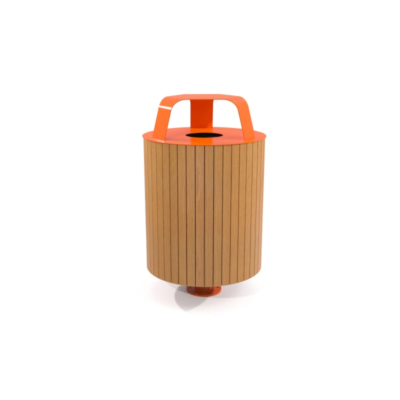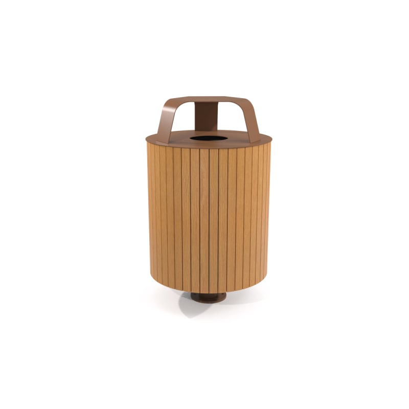Modern, round single post litter bin with hood for outdoors. 360° panel design in hardwood colors or cut-out designs in powder-coat finishes.