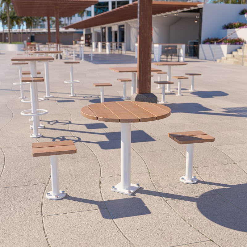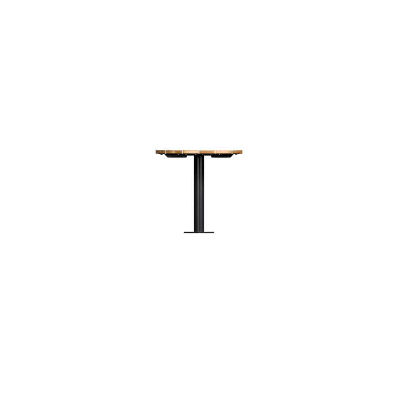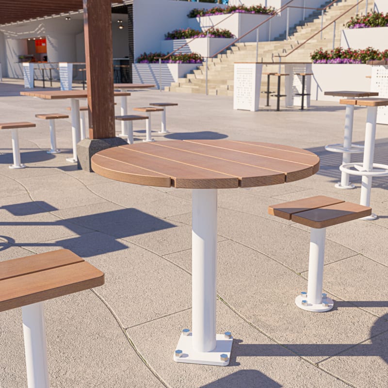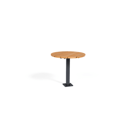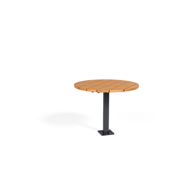 Modern round table design in 3 sizes with contrasting finishes. Battens in hardwood or Duraslat™ colors and steel post in powder-coat finishes.