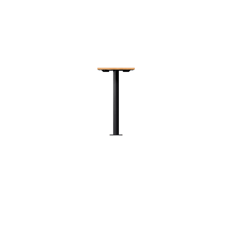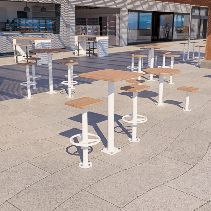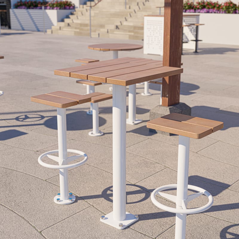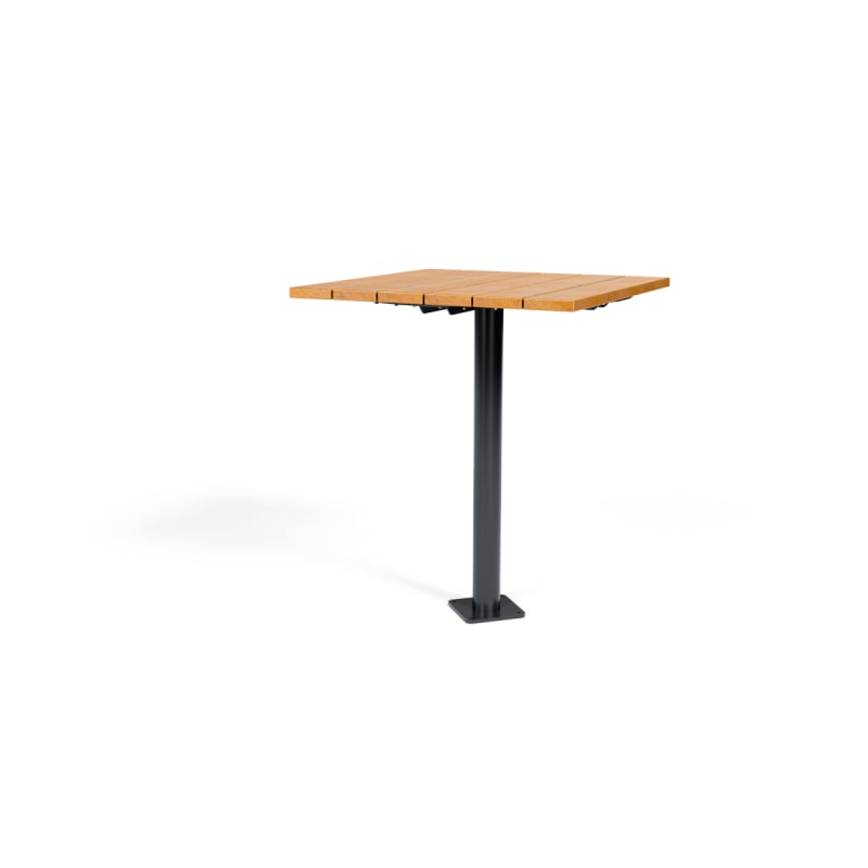 Modern square bar table design in 2 sizes. Contrasting finishes. Battens in hardwood or Duraslat™ colors, steel post in powder-coat finishes.