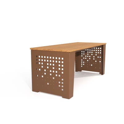 Modern table design with contrasting finishes, folded forms. Battens in hardwood or Duraslat colors and steel frame in powder-coat finishes.