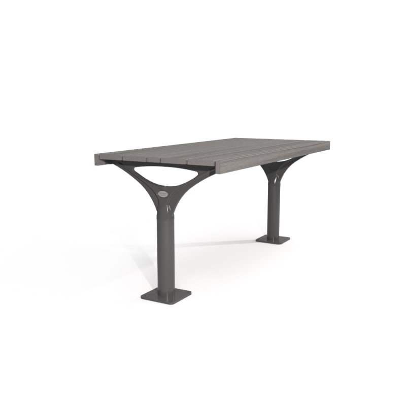 Timeless post table design. Batten top in hardwood or Duraslat™ supported by an elegant cast aluminum frame in powder-coat finishes.